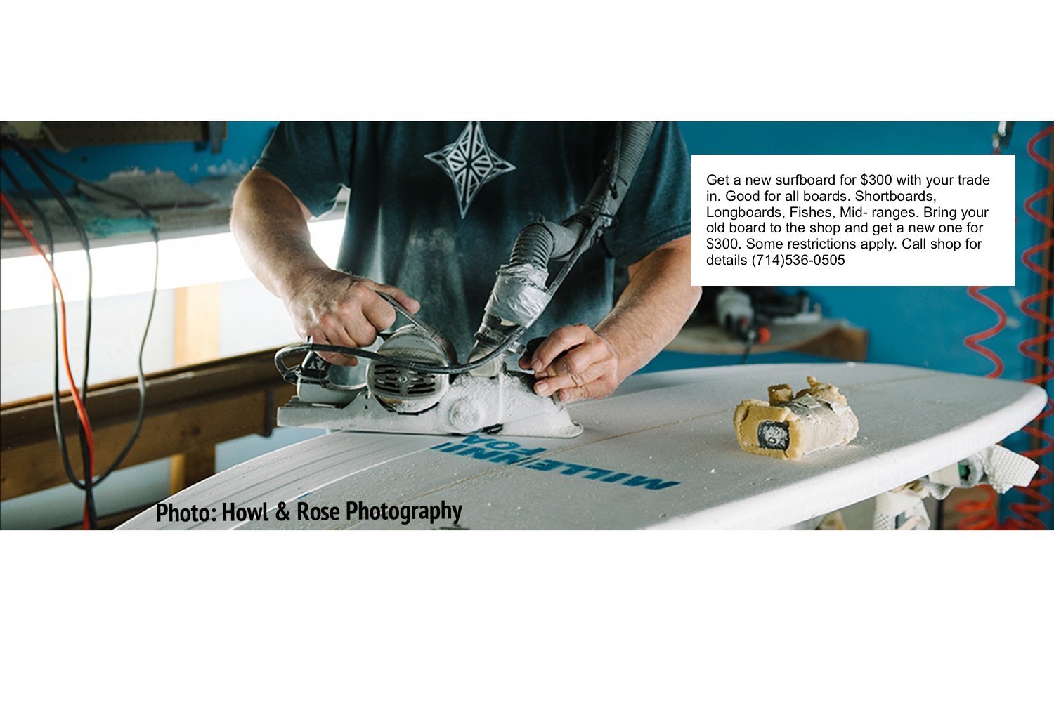 Get a new surfboard for $300.00 with your trade-in. Good for all boards. Shortboards, Longboards, Fishes, Mid-ranges. Bring in your old board to the shop in downtown Huntington Beach and get a new one for $300. Some restrictions apply.